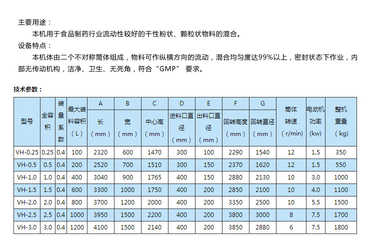 本機適用于制藥、化工、食品的干粉狀、顆粒裝物料的混合。該機混料筒結構獨特,混合均勻,效率高,不積料。整機結構簡單,操作容易。外表面和物料接觸部分均采用優(yōu)質(zhì)不銹鋼制造,造型美觀,維護、清洗方便。